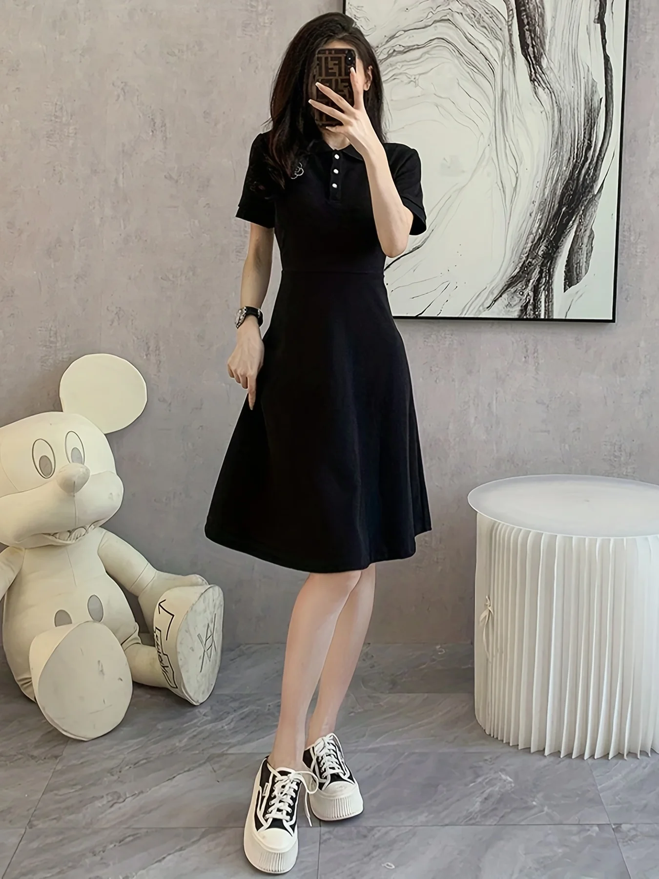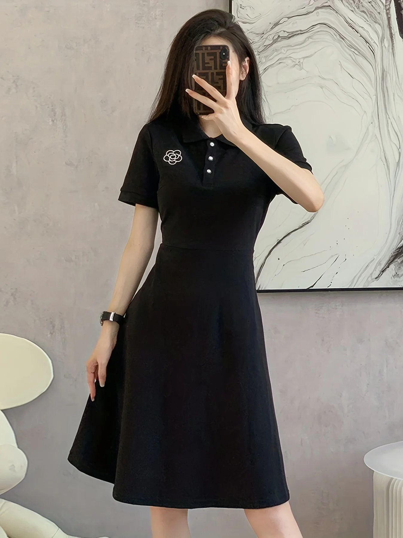 Elevate your summer wardrobe with this elegant knee-length A-line dress. Featuring a classic polo neckline and delicate embroidery, it combines professional style with feminine charm. The slim fit and regular sleeves create a flattering silhouette, making it perfect for office wear or sophisticated casual occasions.